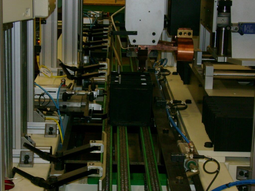 Battery intercell welding station in which the individual cells are connected in series to form the cell pack. The positioning of the welding electrodes is done automatically according to the recipe, via controlled axes, according to the type of coil to be produced. The welding and the check is carried out with a SAFCO control unit.