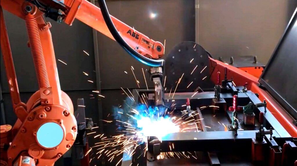Positioning lines and robotic stations for welding car parts with ABB anthropomorphic robot.