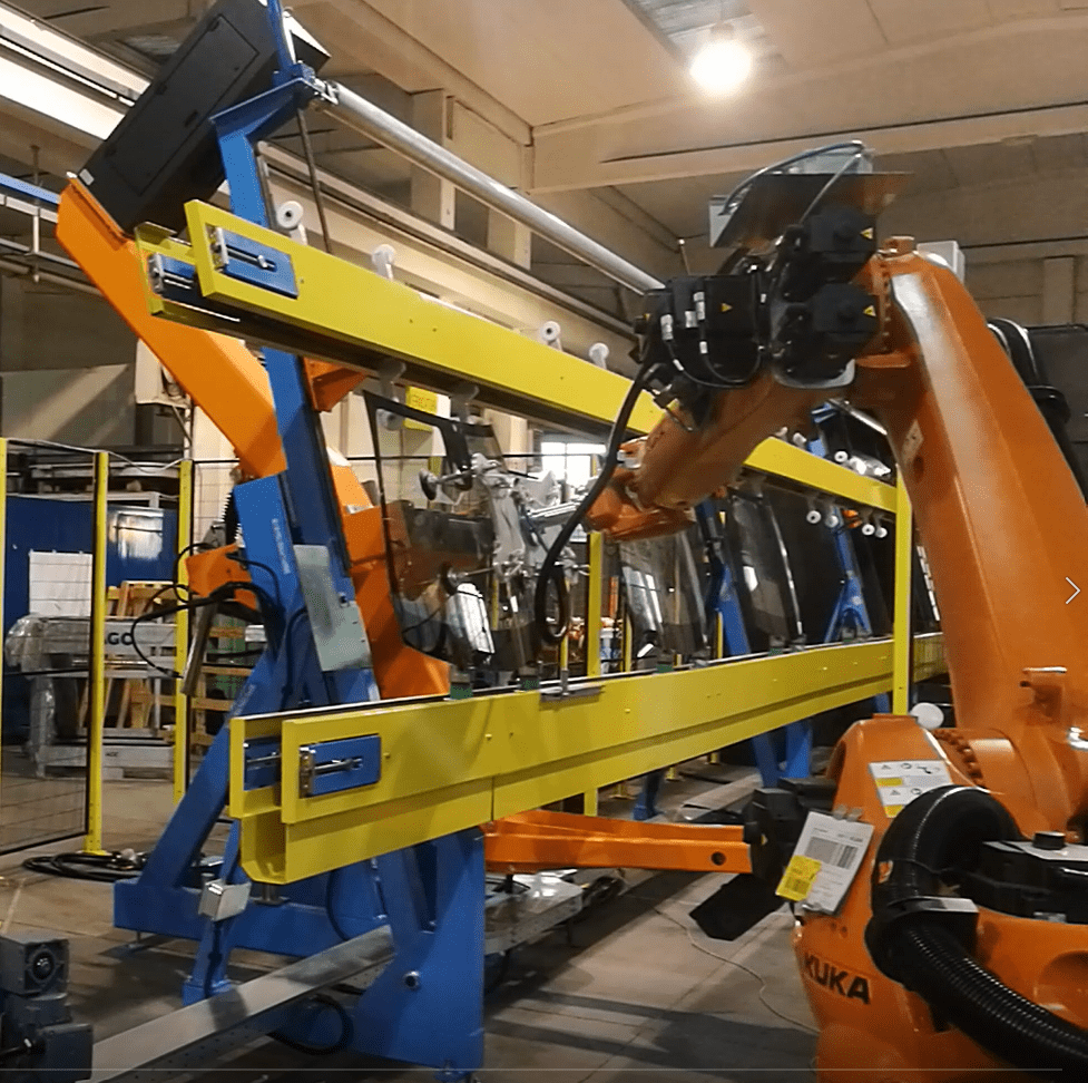 Robotic station for loading and unloading the car front arm using Kuka anthropomorphic robot, with temporary storage on basket.